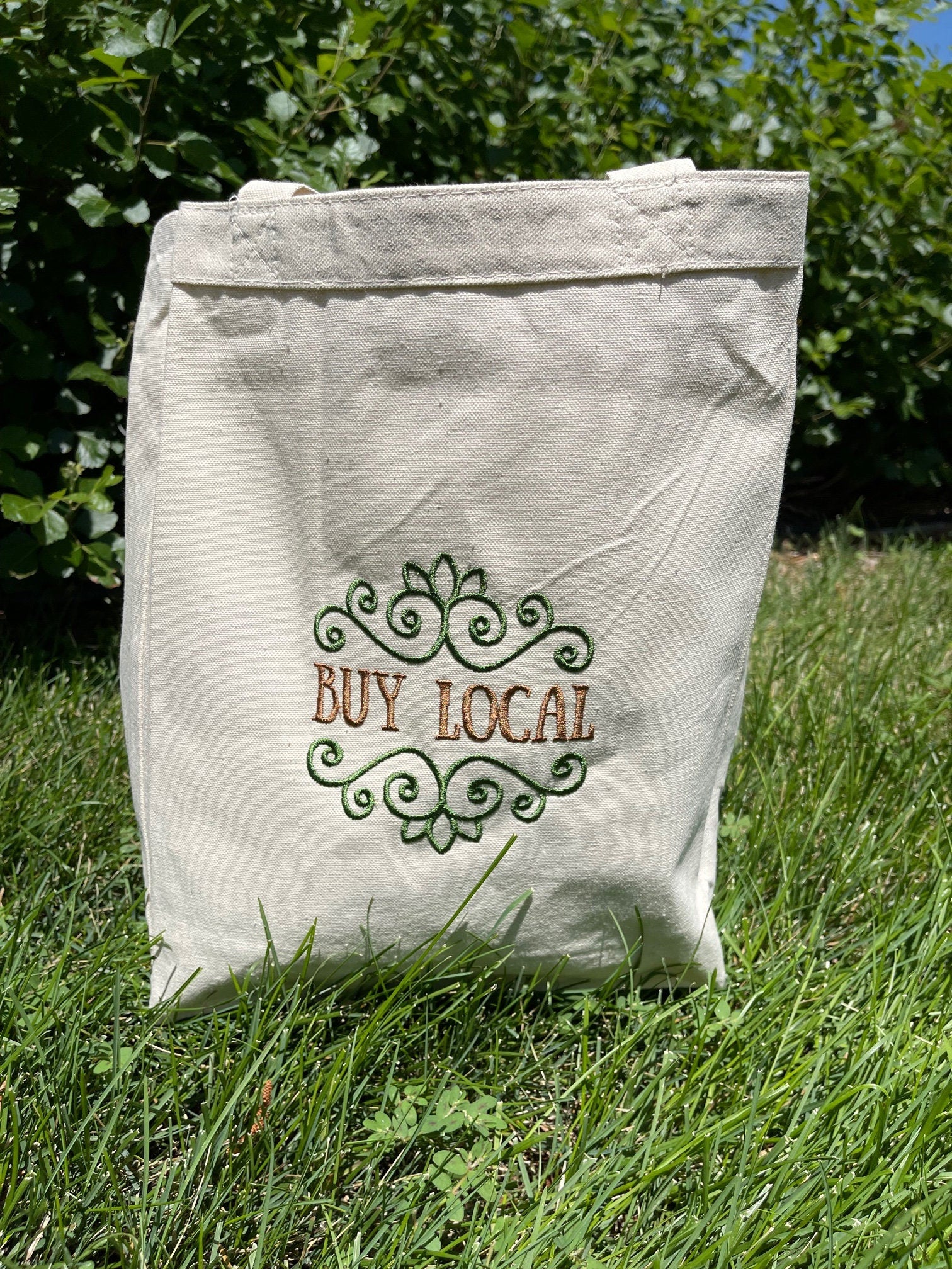 This cute tote bag is reusable and sturdy! Comes with the "Buy Local" embroidery 10-1/2"W x 14"H x 5"D 23" Handles