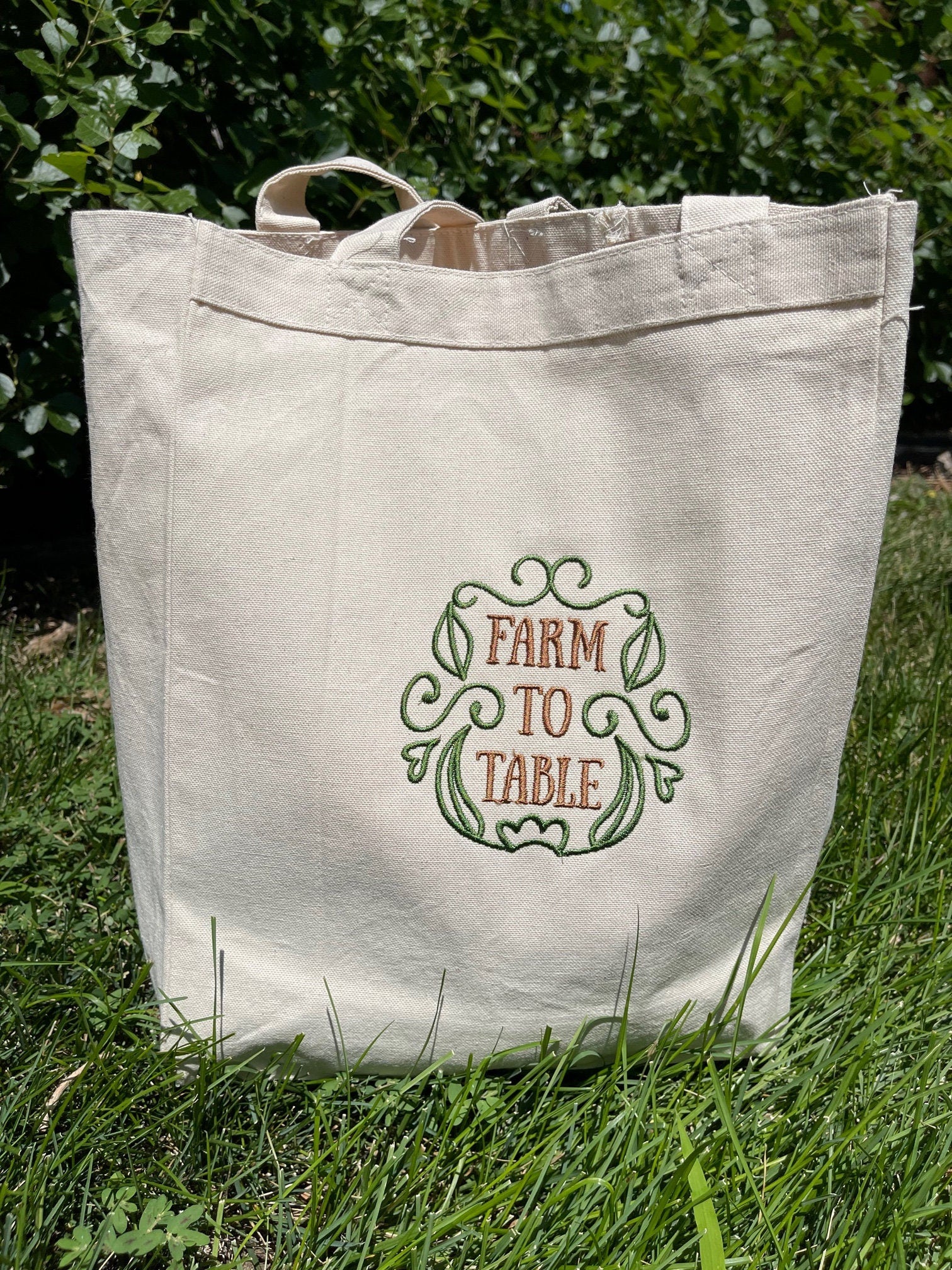 This cute tote bag is reusable and sturdy! Comes with the "Farm to Table" embroidery 10-1/2"W x 14"H x 5"D 23" Handles