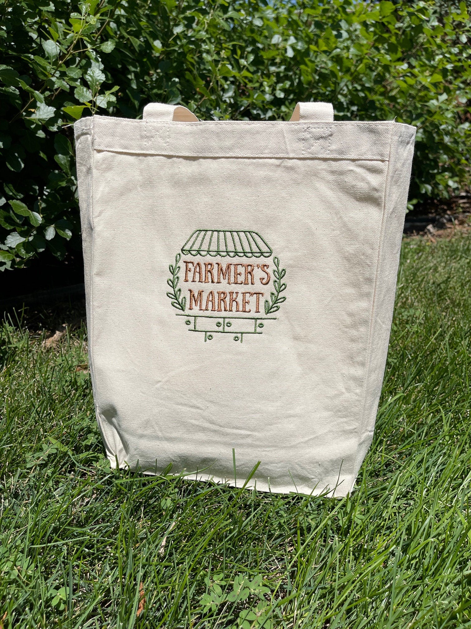 This cute tote bag is reusable and sturdy! Comes with the "Farmers Market" embroidery 10-1/2"W x 14"H x 5"D 23" Handles