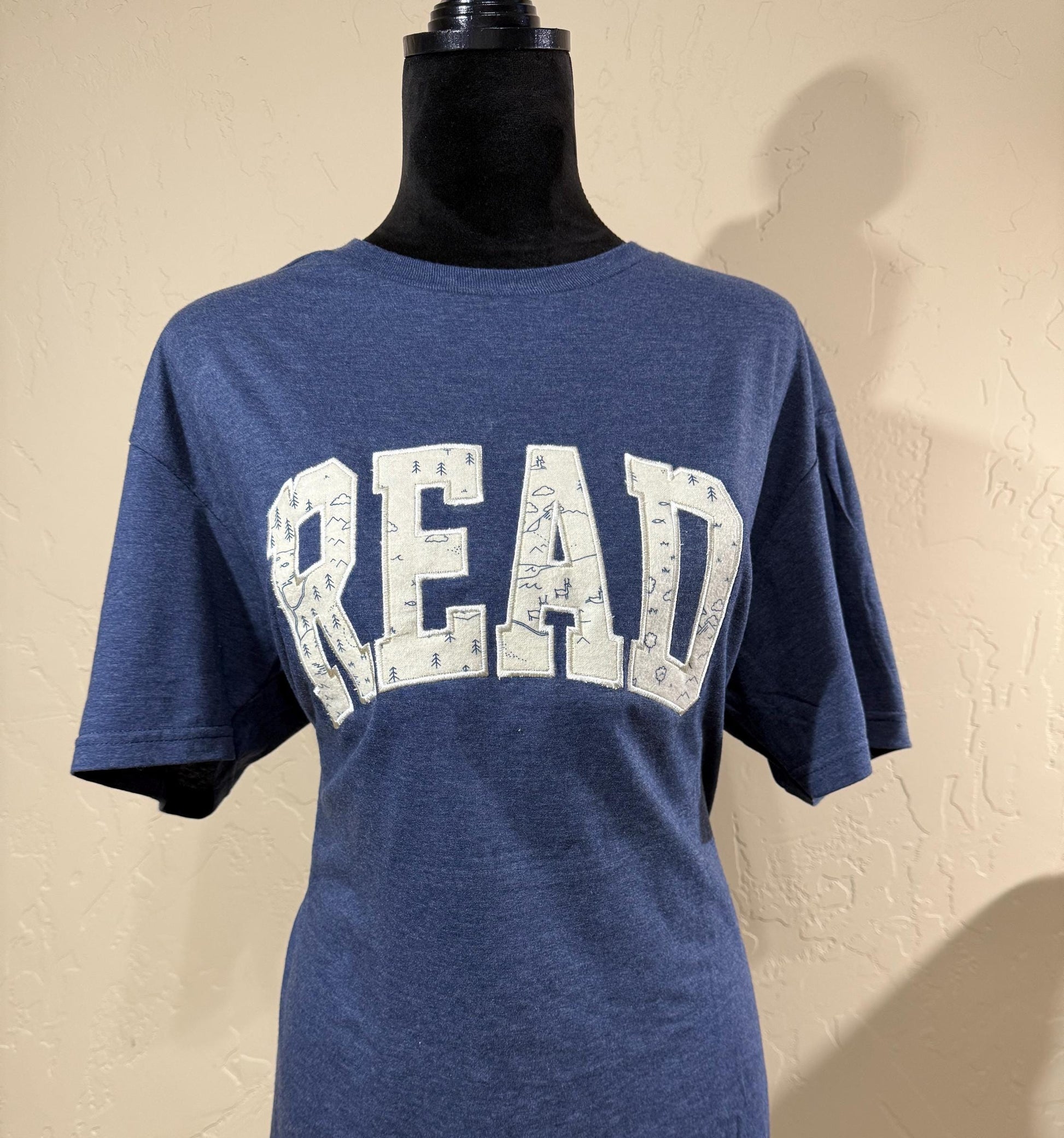This cozy and unique READ appliqué t-shirt is the perfect statement piece for book lovers, teachers, librarians, and reading advocates! Featuring bold varsity-style letters stitched in a cream fabric with a navy blue wilderness sketch print, this shirt blends a classic aesthetic with a rustic, adventurous touch. The detailed print includes trees, mountains, deer, birds, and clouds—perfect for those who love reading and the outdoors!