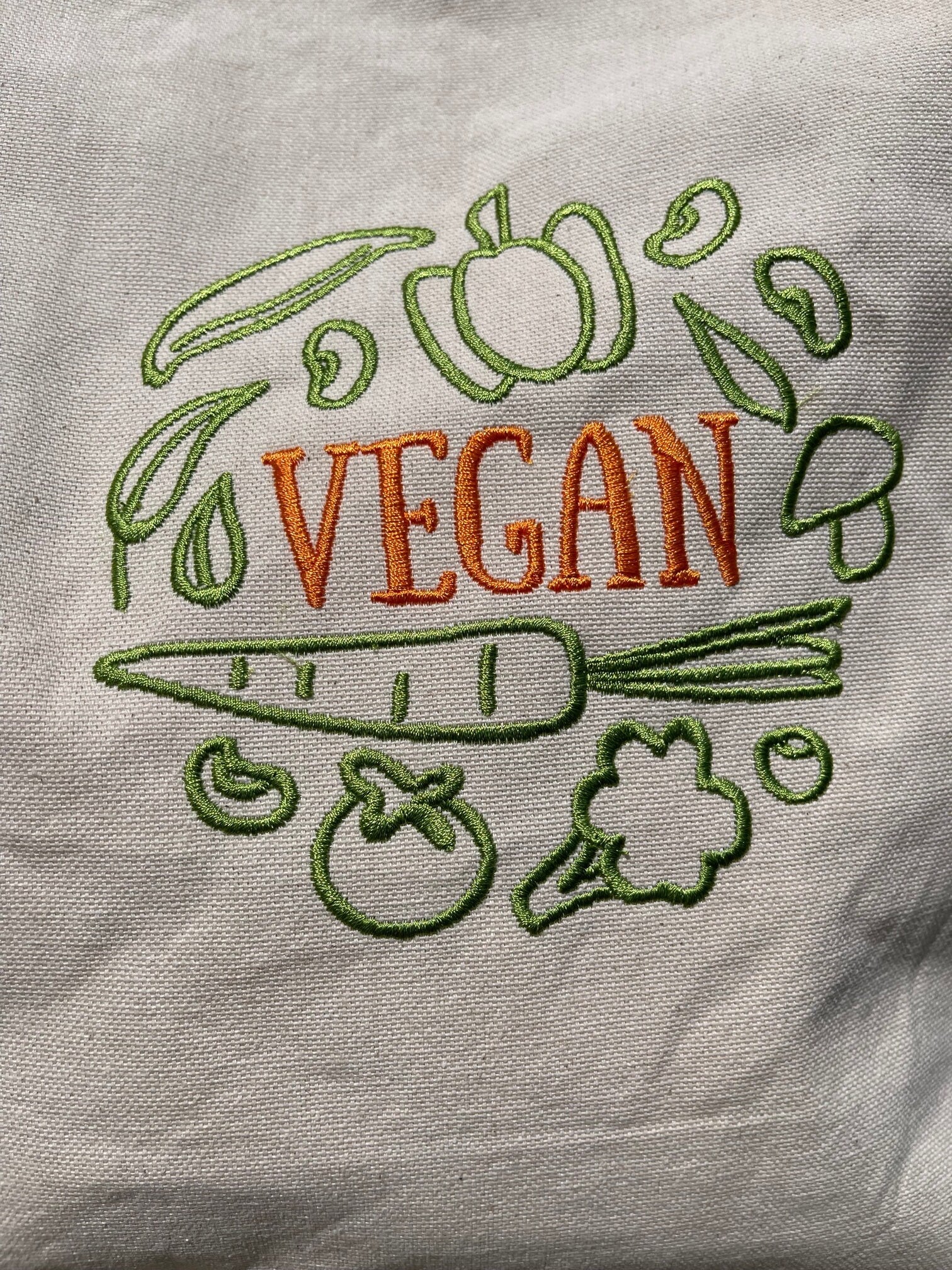 This cute tote bag is reusable and sturdy! Comes with the "Vegan" embroidery 10-1/2"W x 14"H x 5"D 23" Handles
